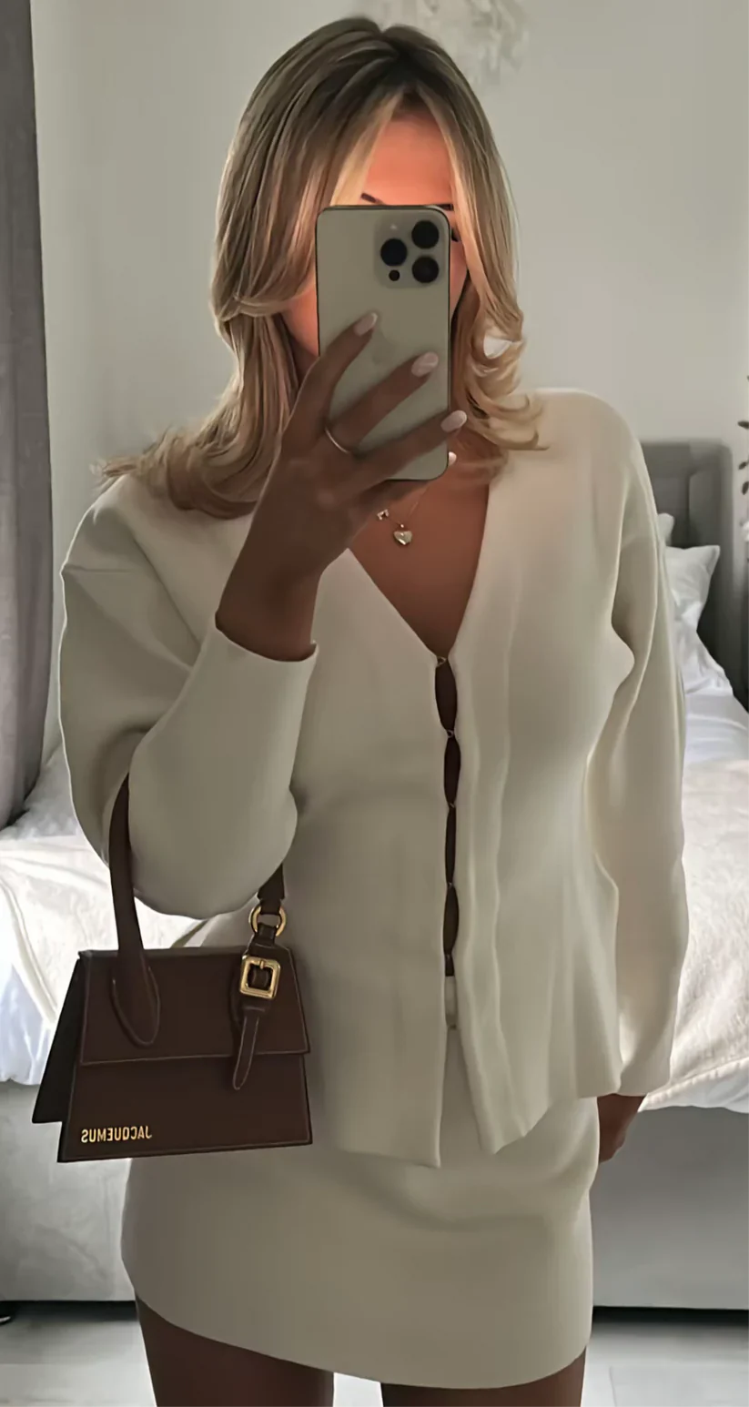 - Chic Co-Ord Set: A matching cardigan and mini skirt combination that creates a sleek, put-together look with minimal effort.